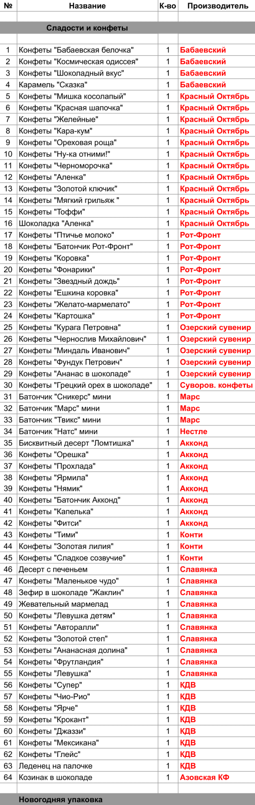 Конфеты "Мишка косолапый" (1 шт), Конфеты "Красная шапочка" (1 шт), Конфеты "Желейные" (1 шт), Конфеты "Кара-кум" (1 шт), Конфеты "Ореховая роща" (1 шт), Конфеты "Ну-ка отними!" (1 шт), Конфеты "Черноморочка" (1 шт), Конфеты "Аленка" (1 шт), Конфеты "Золотой ключик" (1 шт), Конфеты "Мягкий грильяж " (1 шт), Конфеты "Toффи" (1 шт), Шоколадка "Аленка" (1 шт)
